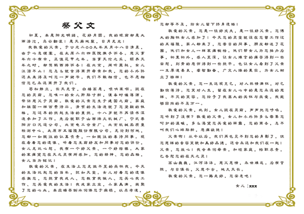 告别仪式、追悼会、周年祭祀、安放仪式上,一篇催人泪下感人至深的祭文,不仅表达了对亲人的追思悼念,也能表现出后人晚辈的慎重敬仰之情。